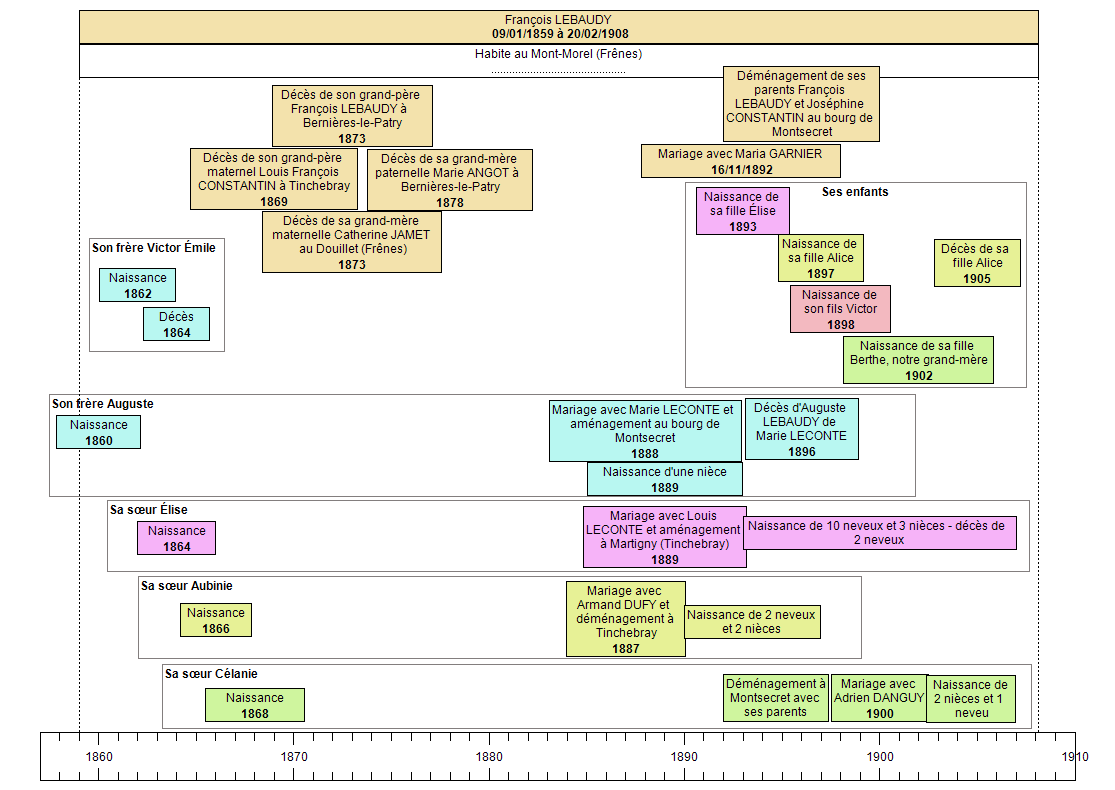 François LEBAUDY, son grand-père paternel, décède aussi en 1873, à l’âge de 85 ans, à l’Ébaudière à Bernières-le-Patry. Enfin, sa grand-mère paternelle, Marie-Anne ANGOT décède en 1878 à l’Ébaudière, à l’âge de 83 ans. François a alors 19 ans.