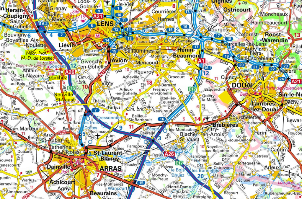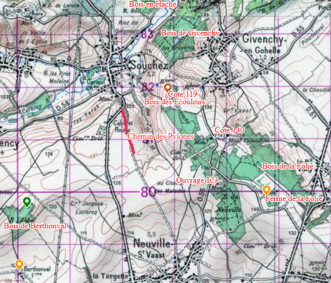 Il est « tué à l’ennemi » au cours de la bataille d’Artois, le 16 juin 1915 à 13h à la côte 123 entre Souchez et Neuville-Saint-Vaast dans le Pas-de-Calais. Ce fut une journée très meurtrière comme tu peux le lire dans le Journal des Marches et Opérations en vue 37 (pages 25 et 26). Voici deux cartes pour situer les lieux. Une première sur laquelle on voit Souchez et Neuville-Saint-Vaast entre Lens et Arras :
