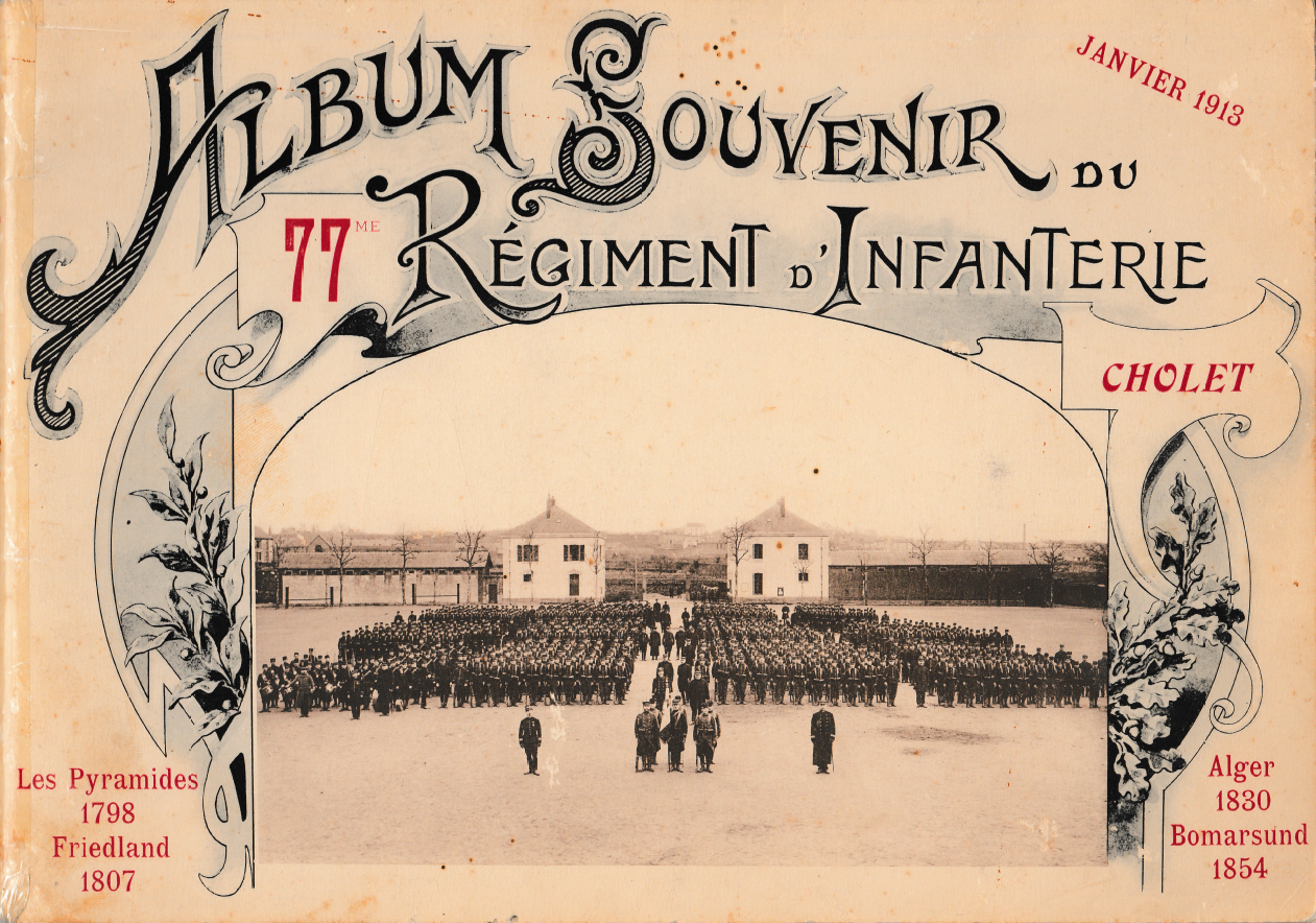 Henri fait son service militaire du 5 novembre 1911 au 8 novembre 1913 au 77e Régiment d’Infanterie à Cholet. Il est promu caporal le 25 septembre 1912 et reçoit un certificat de bonne conduite. Pendant son service, il réalise un très beau cahier de chants avec des illustrations, à propos duquel je t’ai écrit plusieurs fois : Les cahiers du grand-oncle Henri AUBIN, Caroline, par Henri AUBIN et BOURVIL ! et Au Clair de la Lune.
