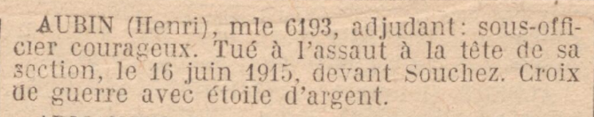 Nous ne savons pas où son corps repose. Voici la réponse que m’a donnée le centre d’histoire du Mémorial 14 – 18 Notre-Dame-de-Lorette : « En raison du nombre de morts et des circonstances de décès, de nombreux hommes morts au combat n’ont pu être récupérés pour être inhumés. Veuillez-nous excuser de ne pas pouvoir vous répondre plus précisément. AUBIN Henri est peut-être inhumé dans l’un des ossuaires de la nécropole de Notre-Dame-de-Lorette ou de la nécropole de la Targette. »