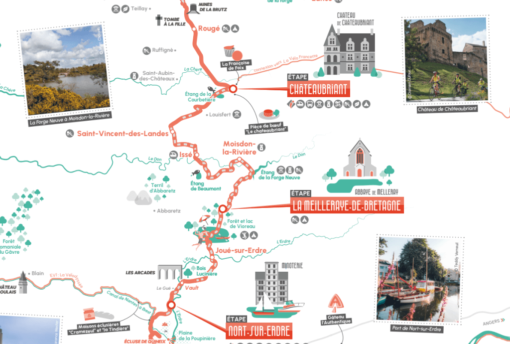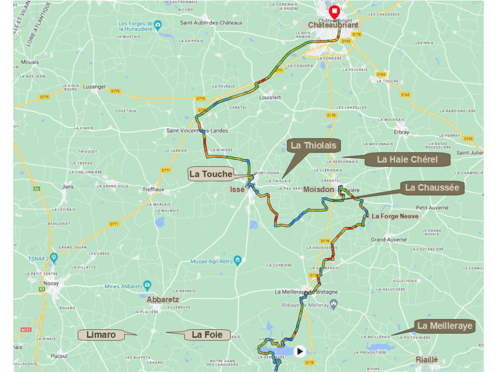 Cet été nous avons parcouru la Régalante en vélo. C’est une véloroute inaugurée en avril 2024 reliant Nantes au Mont-Saint-Michel en 275 kilomètres. Elle emprunte soit des petites routes, soit des pistes cyclables. Son parcours, lors des étapes reliant Nort-sur-Erdre à la Meilleraye-de-Bretagne, et de la Meilleraye-de-Bretagne à Châteaubriant, passe sur les terres de nos ancêtres. Voici un extrait de sa carte :