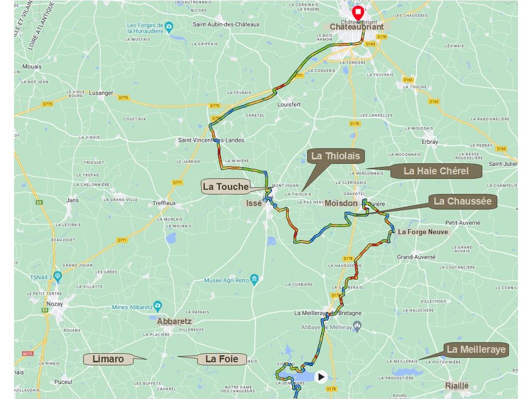 Après avoir traversé Joué-sur-Erdre, nous contournons le lac du Vioreau. Nous passons alors à environ 10 kilomètres à l’est de deux hameaux d’Abbaretz dont je t’ai déjà parlé :