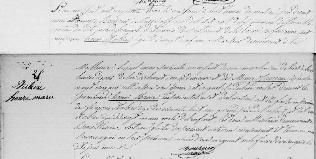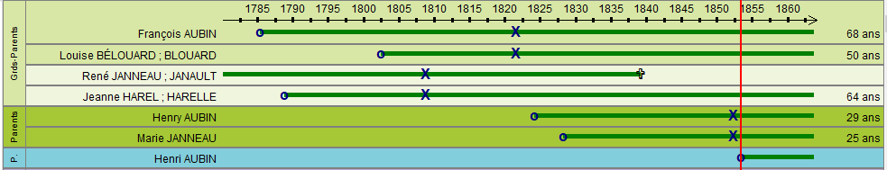 Son grand-père paternel, François AUBIN, décède en 1864. Henri a alors 11 ans. Jeanne Harel, sa grand-mère maternelle, décède en 1870 (Henri a 17 ans) et Louise BÉLOUARD, sa grand-mère paternelle en 1884 (Henri a 31 ans).