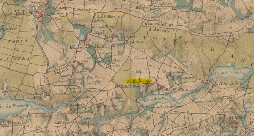 Pour terminer, voici deux cartes sur lesquelles figurent les communes et les villages dans lesquels a vécu Henri. Tout d’abord à Riaillé (le village de la Meilleraye est au centre, Riaillé au coin sud-est, la commune de la Meilleraye-de-Bretagne au coin nord-ouest) :