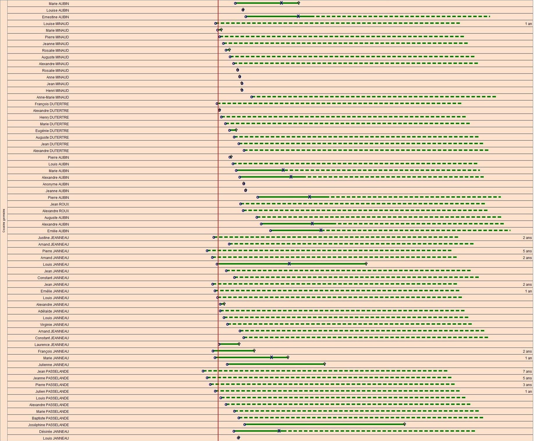 Il a 39 cousins et 27 cousines, et peut-être plus, n’étant pas certain de les avoir tous recensés ! 13 sont nés avant lui, le plus âgé, Jean PASSELANDE, cousin du côté maternel, a 7 ans à sa naissance. La plus jeune, Emilie AUBIN naîtra en 1879, Henri a alors 25 ans. Je ne suis pas certain qu’il les connaissait tous… en voici la liste (que tu peux agrandir pour mieux la lire en cliquant sur l’image) :