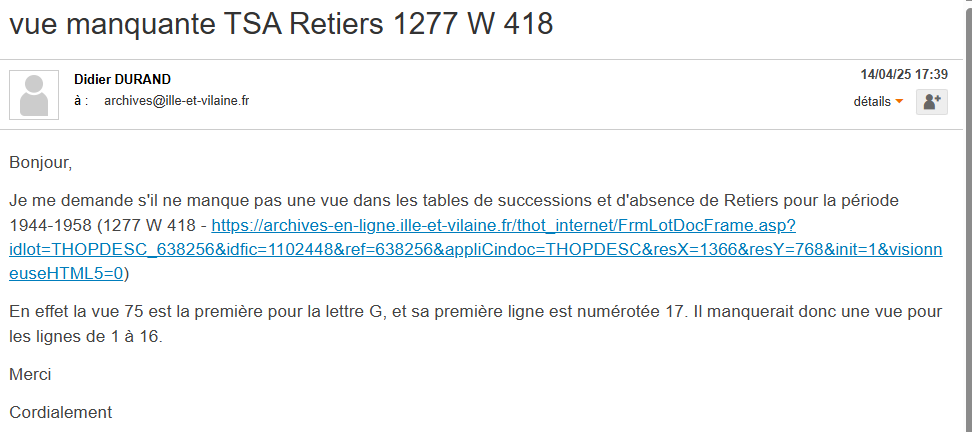 En consultant la Table des Successions et Absences de Retiers sur le site des Archives d’Ille-et-Vilaine, je ne trouve pas trace du décès de Joséphine GILLES, mais il manque une page. Peut-être est-elle sur cette page, je l’espère ! Je m’adresse donc aux archives d’Ille et Vilaine pour leur signaler cette absence :