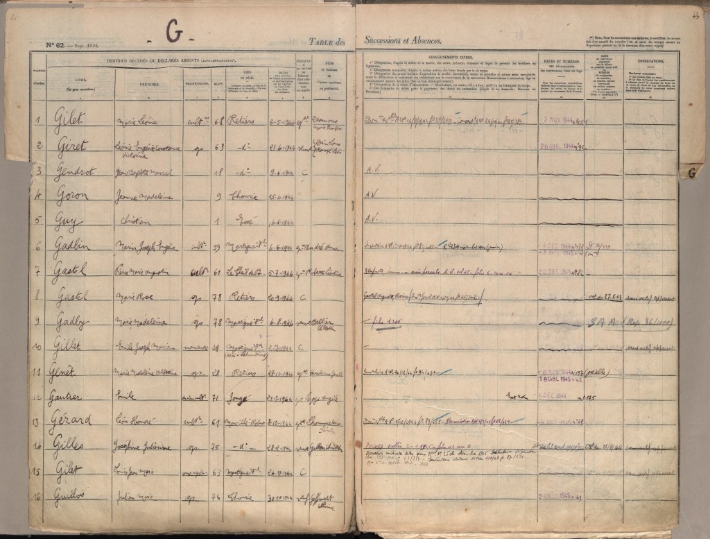 On y voit en ligne 14, Joséphine Julienne GILLES décédée le 28 décembre 1944. Il est précisé que le décès a eu lieu à Marcillé-Robert.