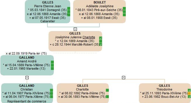 - La mère de Christian GALLAND et de Théodorine GILLES : elle est née le 12 avril 1869 à Amanlis, fille de Pierre GILLES, cabaretier, et Adélaïde BOULET, fileuse et décédée le 28 décembre 1944 à Marcillé-Robert en Ille-et-Vilaine. Son prénom d’usage semble être aussi Charlotte.