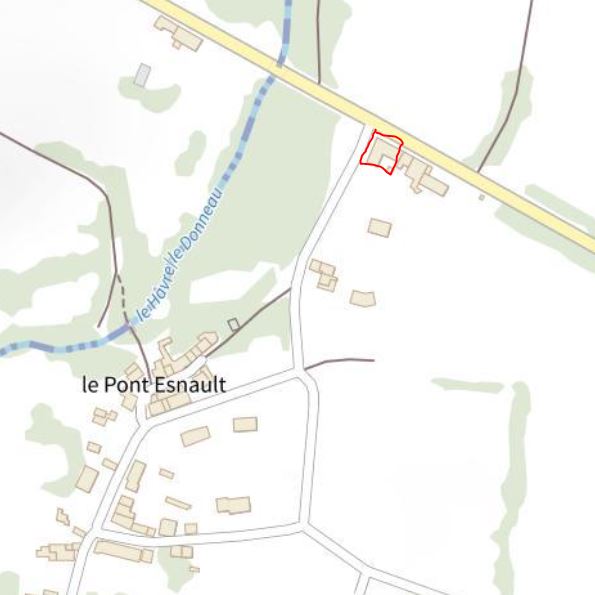 - Le Pont-Esnault, Mésanger (Loire-Inférieure) : ce domicile est indiqué sur la fiche matricule de notre grand-père en août 1931. La famille y est recensée en 1936. C’est ici que naissent les cadets et que tous les enfants grandiront. Les enfants vont au catéchisme et à l’école de Couffé, car son bourg est situé moins loin que celui de Mésanger (4 km au lieu de 6 km). La maison est située à l’angle de la route départementale et de la voie qui pénètre dans le hameau (entourée en rouge sur ce plan) :