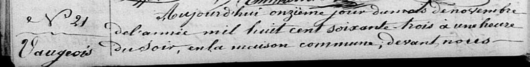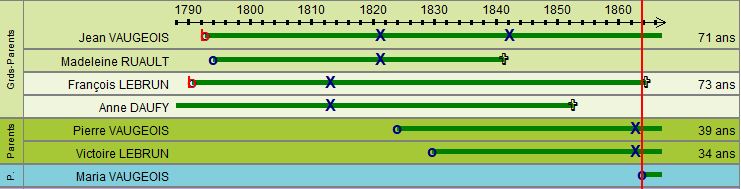 Pierre VAUGEOIS, son père, décède le 20 juillet 1871 à l’âge de 47 ans. Maria approche de ses 8 ans, et son petit frère Victor de ses 2 ans. Leur mère, Victoire LEBRUN a 41 ans. Le frère puiné de Pierre, François VAUGEOIS, qui a alors 45 ans, vient s’installer avec eux au Noyer. On le trouve présent dans le foyer dès le recensement de 1872.