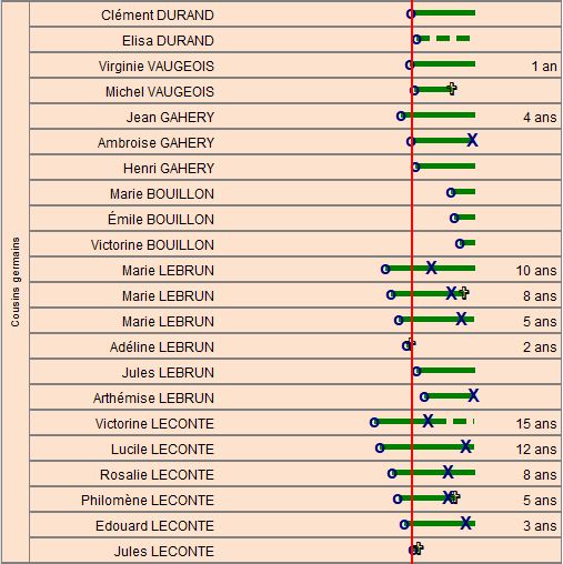 Maria a 9 cousins, 13 cousines, dont certains sont demi-cousins ou demi-cousines puisque petits-enfants du grand-père paternel de Maria avec sa seconde épouse. A sa naissance, la plus âgée est Victorine LECONTE âgée de 15 ans, fille de Marie LEBRUN, sœur de la mère de Maria. Maria a 19 ans quand naît sa plus jeune cousine en 1882, Victorine BOUILLON, qui est la fille de Geneviève VAUGEOIS, demi-sœur de son père.