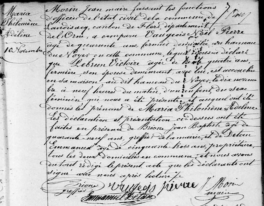 - Anne Louise VAUGEOIS, domestique, épouse Nicolas CHATEL, aussi domestique, 10 ans après la naissance de Maria. Anne Louise est alors domiciliée à la Lande-Patry. A ma connaissance, ils n’ont pas eu d’enfant.