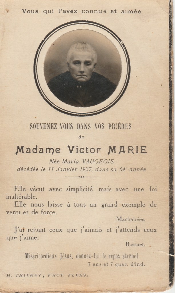 Je termine la série des articles sur nos arrière-grands-parents, avec une arrière-grand-mère Camembert : Maria VAUGEOIS. Comme elle est la femme de Victor MARIE, ne soit pas étonné(e) que la partie de l’article portant sur leur période de vie commune te rappelle quelque chose, comme par exemple ce que tu as lu dans cet article Notre arrière-grand-père Victor MARIE (1849-1914).