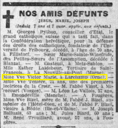 Son décès est mentionné dans le journal la Croix du 21 janvier 1927 :