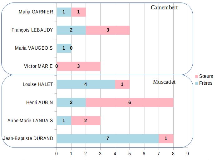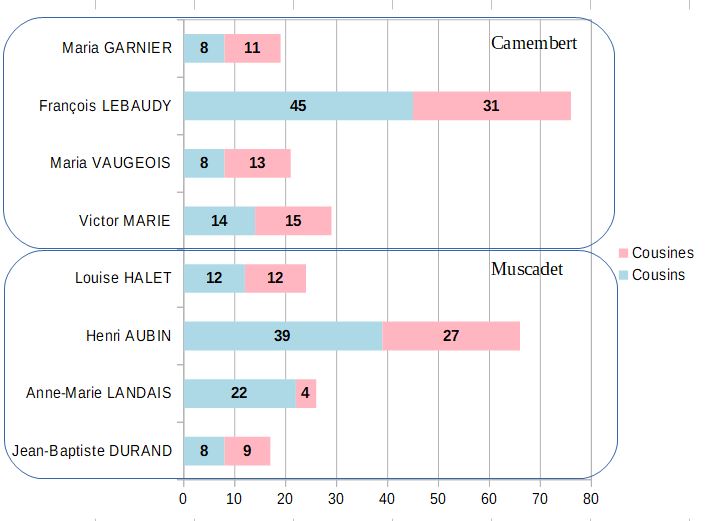 Les moyennes du total de cousins et cousines sont assez proches d’une province à l’autre : 33,25 côté Muscadet, 36,25 côté Camembert. Jean-Baptiste DURAND a le plus petit nombre de cousins et cousines (17), précédé de près par Maria GARNIER (19). François LEBAUDY en a le plus grand nombre (76), suivi par Henri AUBIN (66).