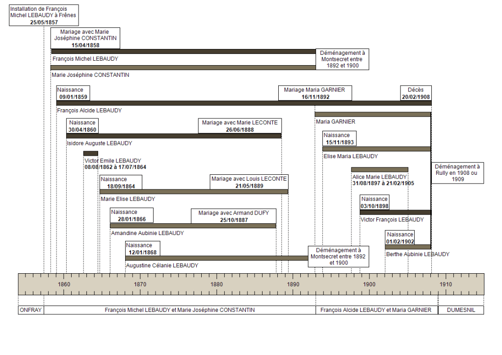 La ferme du Mont Morel a donc été exploitée par nos aïeuls de 1858 à 1908 ou 1909. La frise chronologique ci-dessous indique les périodes au cours desquelles ceux-ci y ont vécu :